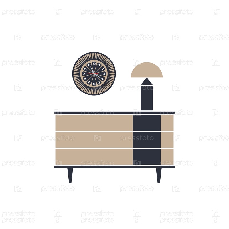 Интерьерная иконка с комодом, настольной лампой, настенными часами