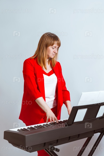 Девушка стоя играет на электронном пианино