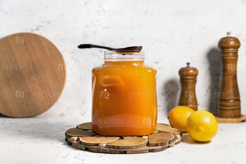 Банка свежего меда с деревянной ложкой и лимонами
