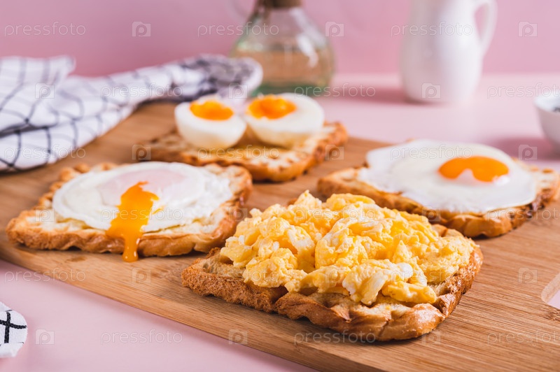 Яичница-болтунья, яйцо-пашот, жареное яйцо, вареное яйцо на тосте на доске