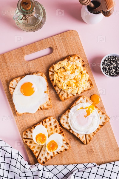 Яйца, приготовленные по разным рецептам на тостах на деревянной доске и вертикальном виде