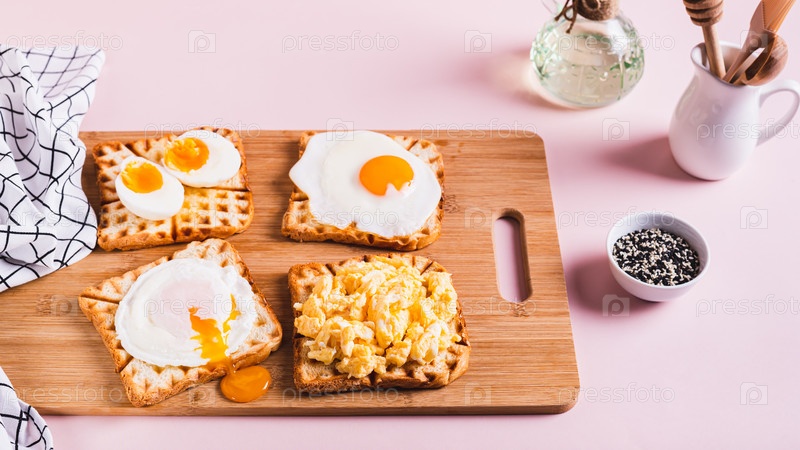 Яичница-болтунья, яйцо-пашот, жареное яйцо, вареное яйцо на тосте на доске веб-баннера