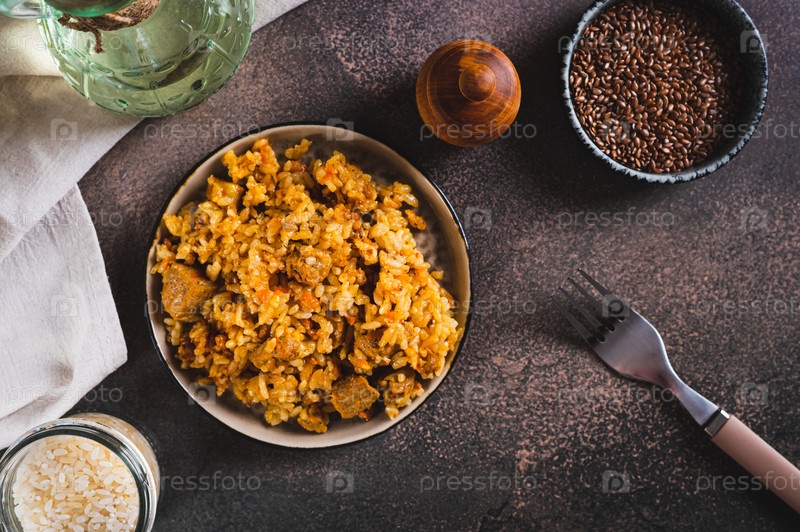 Вкусный азиатский плов с мясом на тарелке на столе, вид