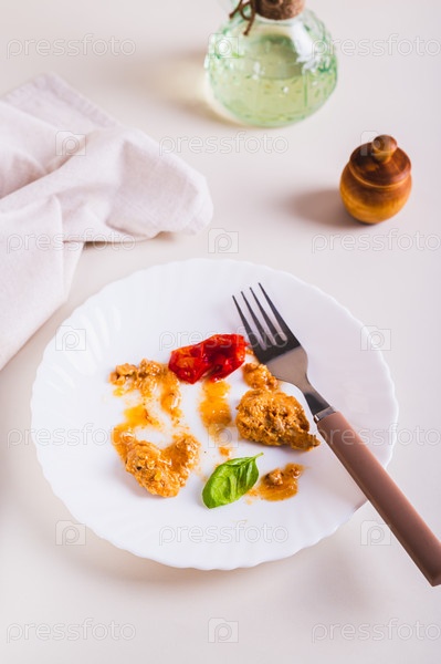Пищевые отходы и столовые приборы на грязной тарелке на столе, вертикальный вид