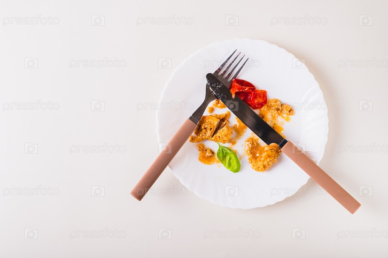 Остановите пищевые отходы. Крупный план остатков еды на тарелке после ужина на столе