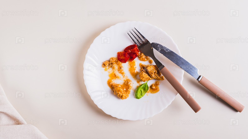 Пищевые отходы и столовые приборы на грязной тарелке на столе, вид веб-баннера