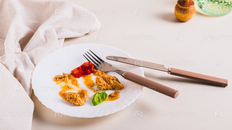 Остановите пищевые отходы. Остатки еды на тарелке после ужина на веб-баннере стола