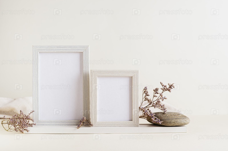 Пустые фоторамки, засушенные цветы и камни на светлом фоне
