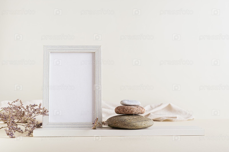 Пустая фоторамка, засушенные цветы и камни на светлом фоне