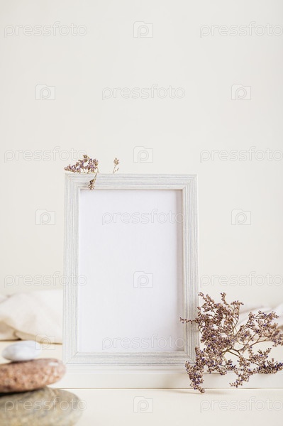 Пустая фоторамка, засушенные цветы и камни на светлом фоне, вертикальный вид