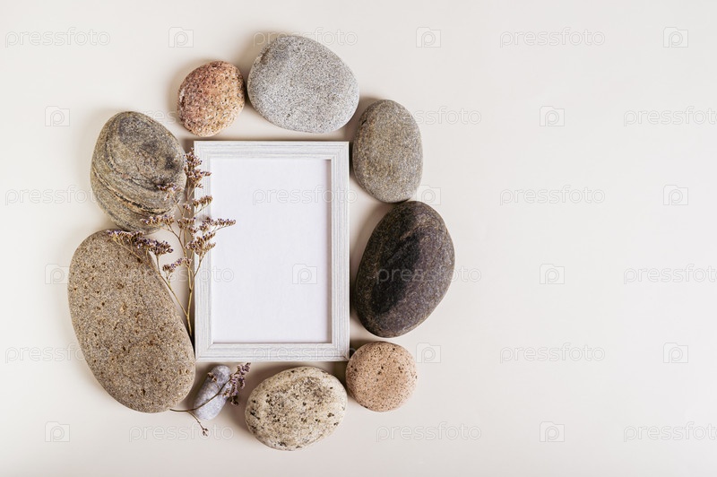Пустая фоторамка с сухим цветком в окружении камней на светлом фоне