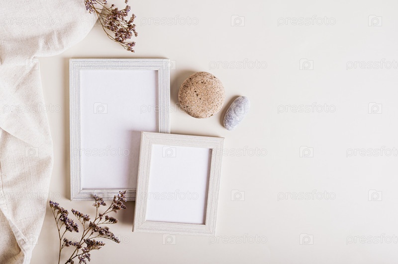 Пара пустых фоторамок, засушенные цветы и камень на светлом фоне