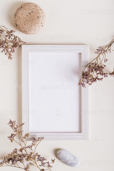Пустая фоторамка, засушенные цветы и камень на светлом фоне сверху и вертикальный вид