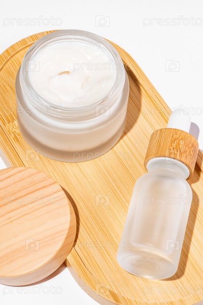 Бамбуковая банка для крема и флакон-капельница с маслом для лица на белом фоне. Макеты косметических контейнеров. Фон для презентации брендинга и упаковки. Концепция натуральной косметики по уходу за кожей