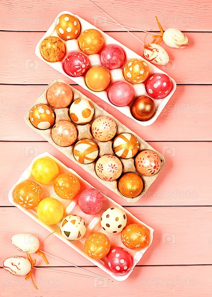 Композиция с украшенными пасхальными яйцами в коробке. Счастливая пасхальная концепция, баннер или реклама для экрана или магазина, шаблон для дизайна, весенняя открытка, выборочный фокус