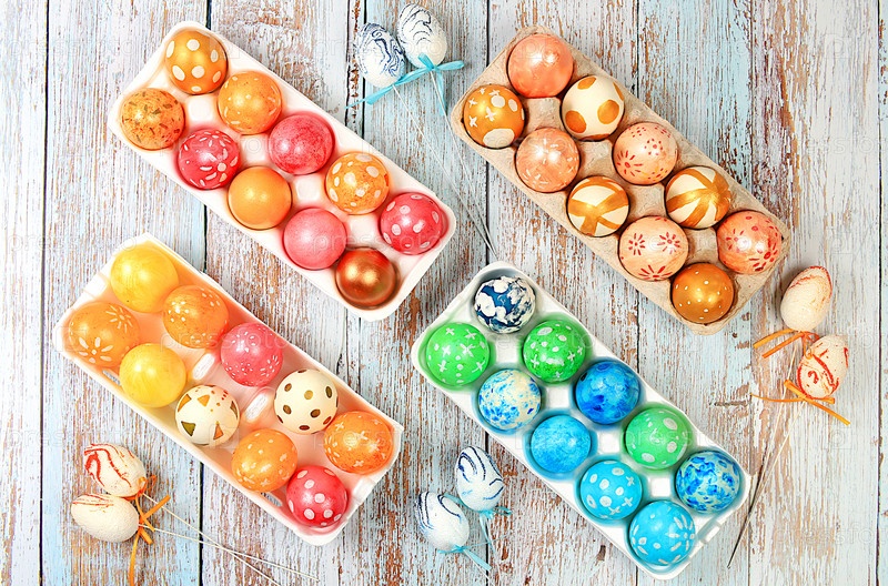 Концепция счастливой Пасхи, композиция с украшенными пасхальными яйцами в коробке, весенняя открытка, баннер или реклама для экрана, магазин, шаблон для дизайна. избирательный фокус