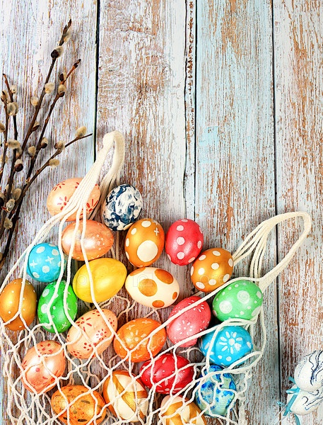 Композиция с украшенными пасхальными яйцами в эко-сумке и ветками вербы. Концепция счастливой Пасхи, баннер или реклама для экрана или магазина, шаблон для дизайна, весенняя открытка,