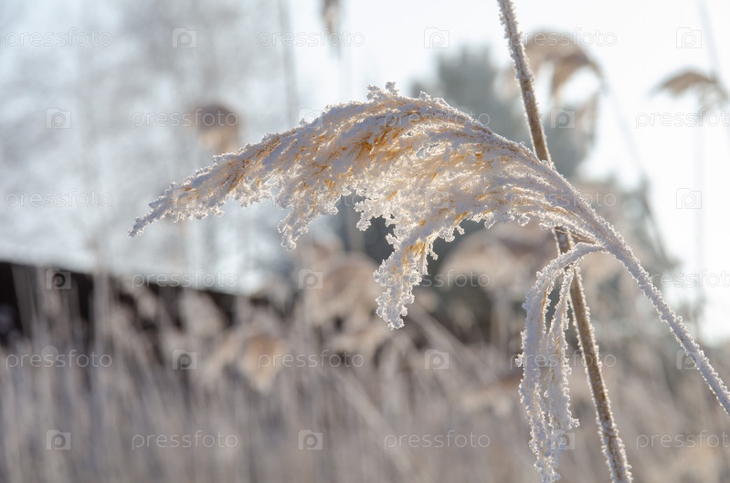 Тростник покрытый инеем в первых лучах солнца
