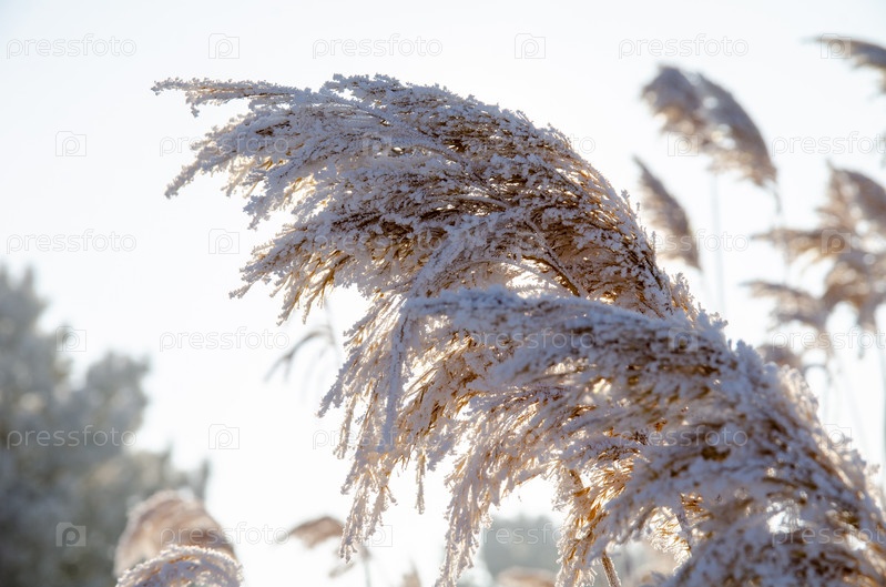 Тростник покрытый инеем в первых лучах солнца
