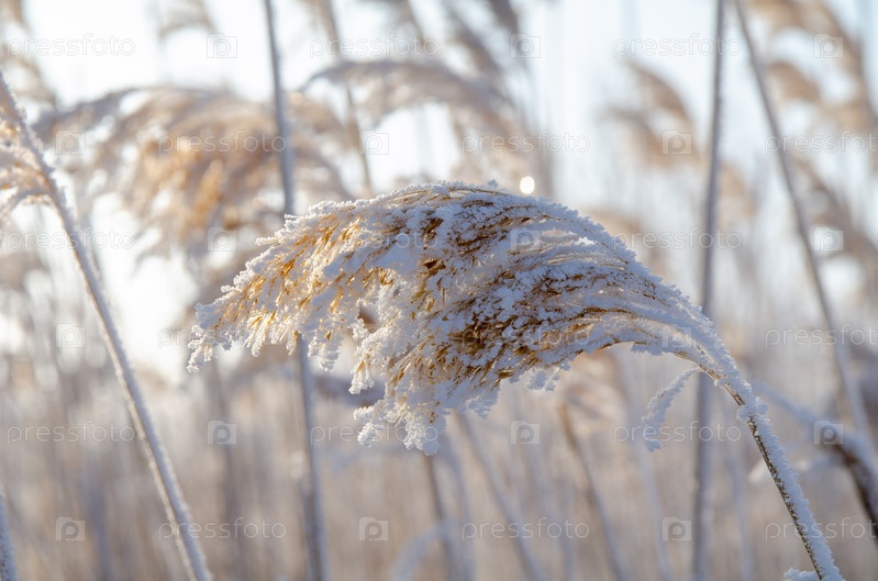 Тростник покрытый инеем в первых лучах солнца