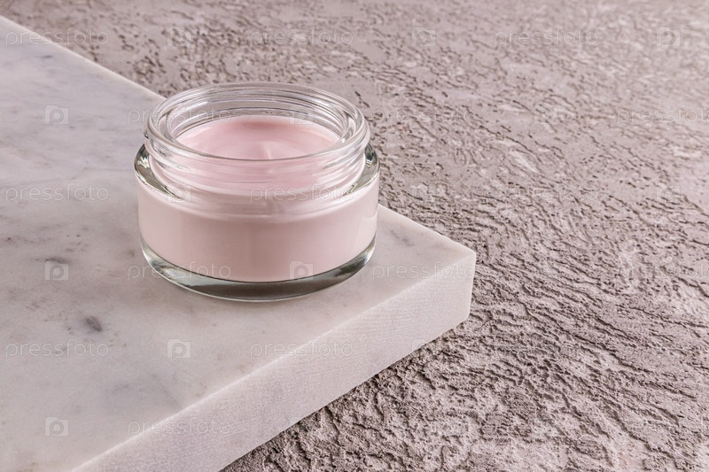 Модный косметический продукт в стеклянной банке, нежный розовый крем для ухода за молодой кожей на мраморном подиуме и сером цементном фоне