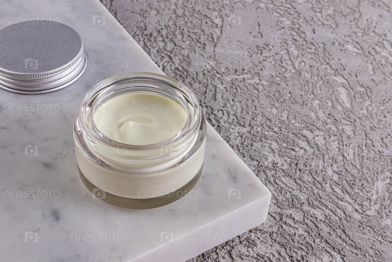 Нежная текстура питательной оливы или алоэ вера в стеклянной косметической банке на подиуме из белого мрамора и сером цементе. Копировальное пространство. макет. упаковка