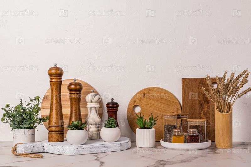 Набор различных мельниц для специй и стеклянных банок с приправами на столешнице из белого мрамора. Стильный кухонный фон в светлых тонах. . Передний план