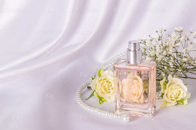 Элегантный флакон женских духов с нежным цветочным ароматом на белом атласном фоне среди чайных роз и жемчужных бусин. Место для копирования
