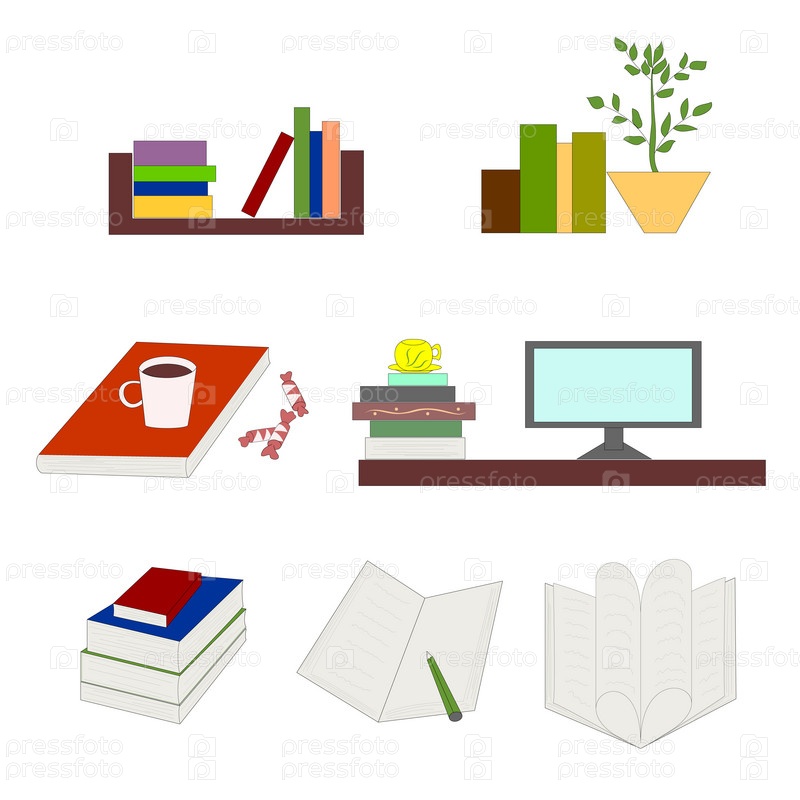 Иллюстрированное изображение книги в разных версиях. Книга, учебники стопками и в одной версии на белом фоне