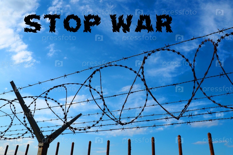 Колючая проволока на фоне голубого неба. Надпись черным цветом «Остановить войну». Не было войны. Понятие свободы, прав человека, тюремного заключения, ограничений, войны, борьбы и протеста. Никаких военных надписей