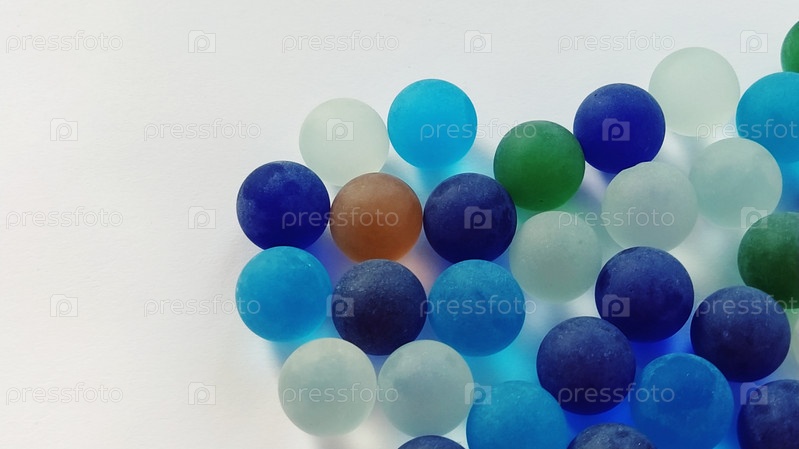 Игровые кликеры или цветные стеклянные шарики, разбросанные по белому фону. задняя подсветка