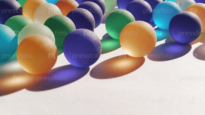 Игровые кликеры или цветные стеклянные шарики, разбросанные по белому фону. задняя подсветка