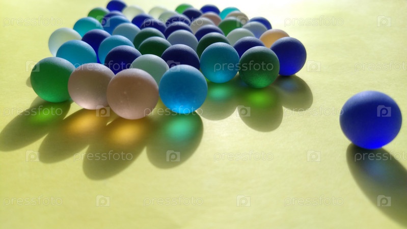 Синие и зеленые стеклянные матовые шарики на желтой поверхности. Частично расфокусирован. Тактильная игра или элемент декора квартиры. Один против всех остальных