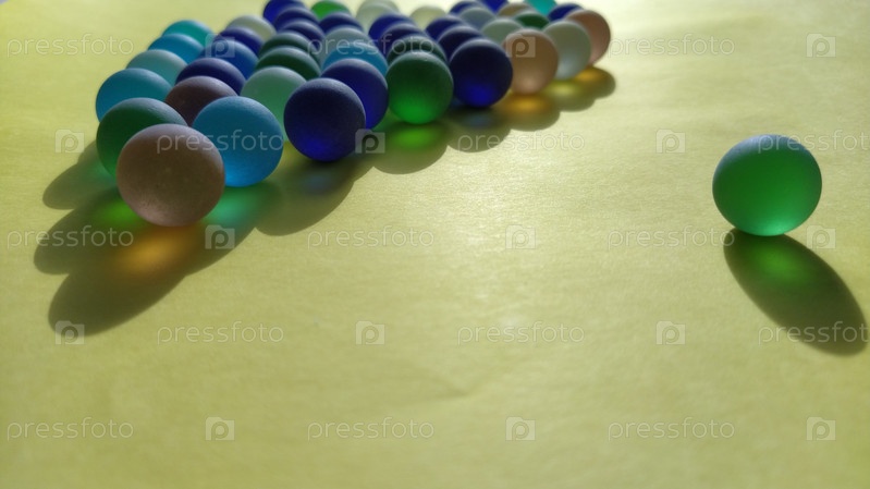 Синие и зеленые стеклянные матовые шарики на желтой поверхности. Частично расфокусирован. Тактильная игра или элемент декора квартиры. Один против всех остальных