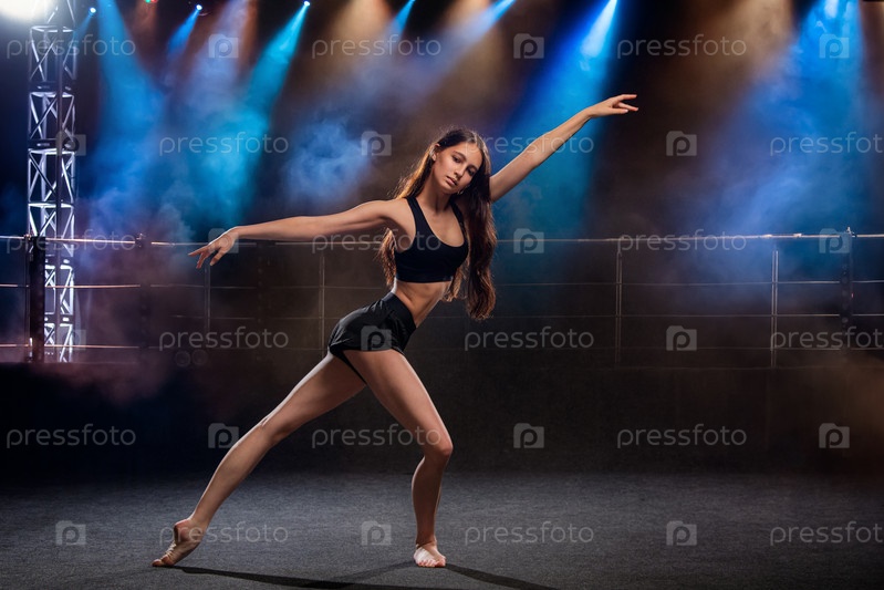 Красивая молодая исполнительница современной хореографии танцует в центре внимания на черном фоне