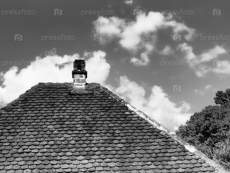 Красная крыша с дымоходом под голубым небом и белыми облаками. Традиционная деревенская черепичная крыша. Сербия, Лозница