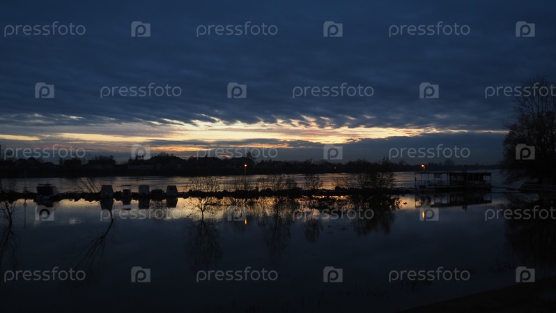 Спокойный пейзаж заката реки Сава Сремска-Мацванска-Митровица, Сербия. Идеальное отражение деревьев и подсветка послесвечения. Рябь на воде. Горизонт. Голубая вода. Желто-розовый закат. Декабрь
