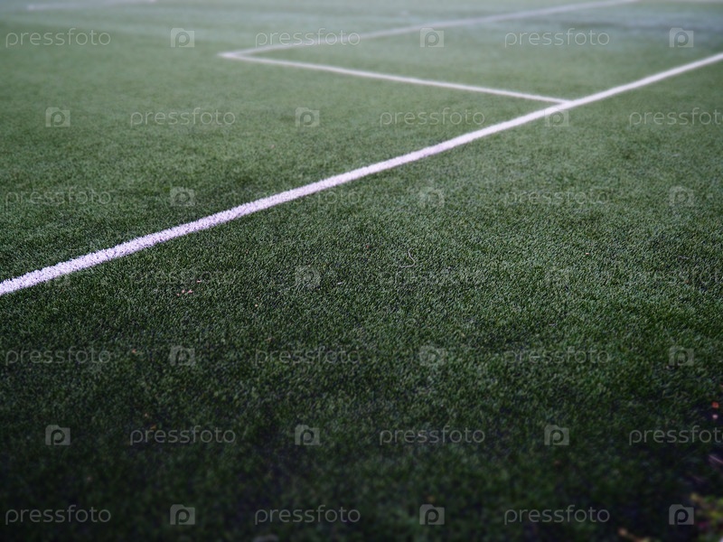 Разметка футбольного поля на зеленой траве. Белые линии шириной не более 12 см или 5 дюймов. Площадь футбольного поля