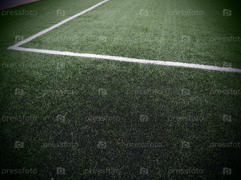 Разметка футбольного поля на зеленой траве. Белые линии шириной не более 12 см или 5 дюймов. Площадь футбольного поля