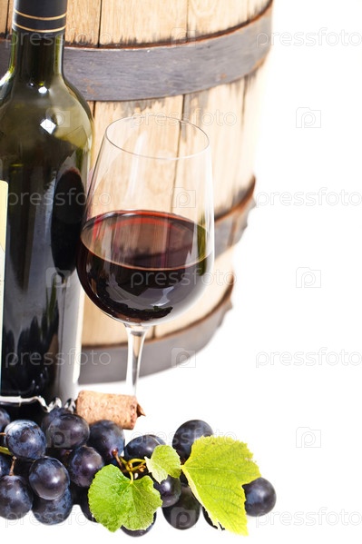 Бокал красного вина, бутылка, бочка и виноград