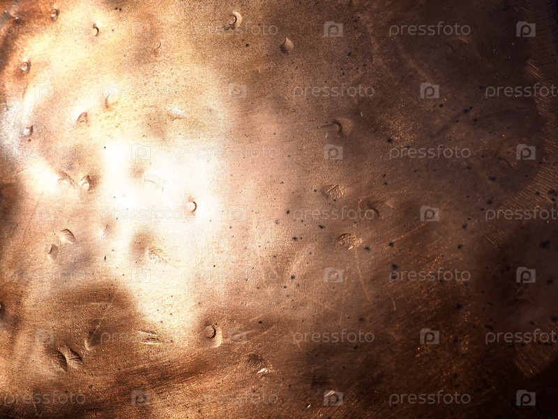 Металлическая бронзовая пластина с текстурой. Полированная поверхность из бронзы или меди с вмятинами, царапинами и углублениями. Металлическая текстура