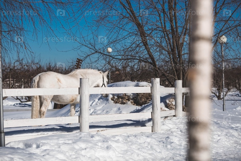Красивый портрет белой лошади в загоне на ранчо зимним утром, на частной экоферме или в контактном зоопарке. Животноводство. Любовь к животным
