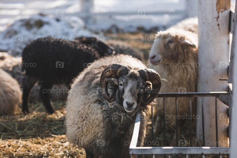Домашний скот. Баран и овца в загоне. Понятие животноводства и сельской жизни. Овцы на свежем воздухе. Крупный план. Домашний питомец на частной экоферме. Сельскохозяйственная промышленность