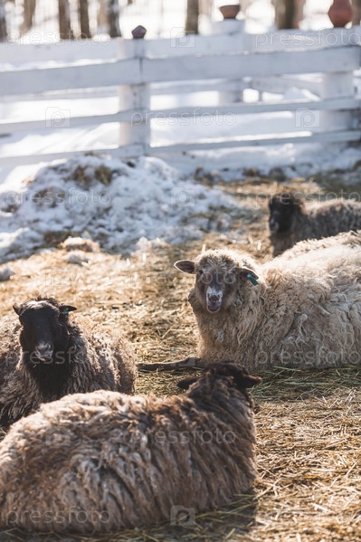 Домашний скот. Баран и овца в загоне. Понятие животноводства и сельской жизни. Овцы на свежем воздухе. Крупный план. Домашний питомец на частной экоферме. Сельскохозяйственная промышленность