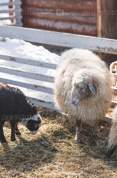 Домашний скот. Баран и овца в загоне. Понятие животноводства и сельской жизни. Овцы на свежем воздухе. Крупный план. Домашний питомец на частной экоферме. Сельскохозяйственная промышленность