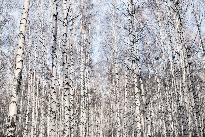 Осенние березы сбросившие листья. Стволы деревьев