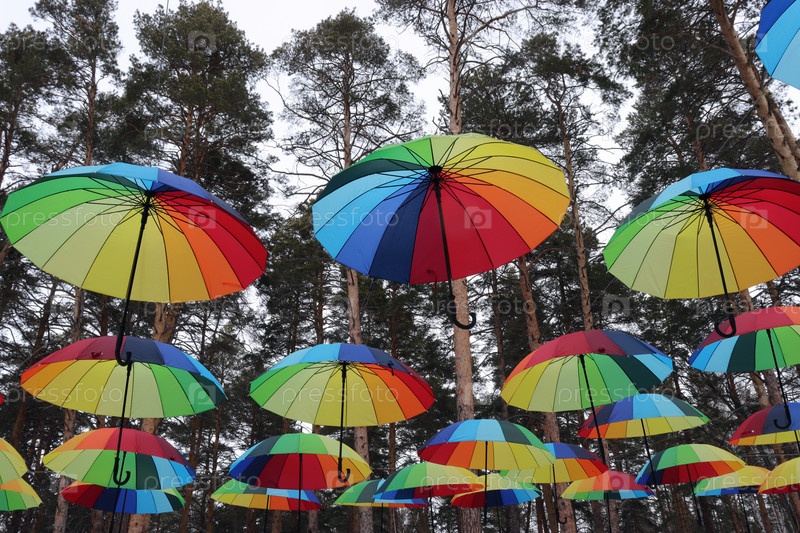 Летающие воздушные разноцветные зонтики на фоне зимнего соснового леса