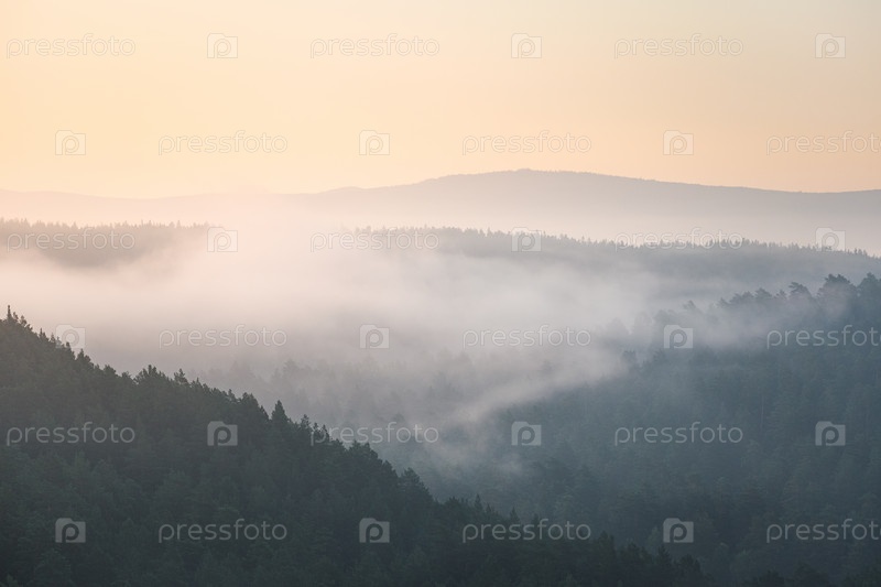 Туман стелется над слоями гор и лесом на рассвете