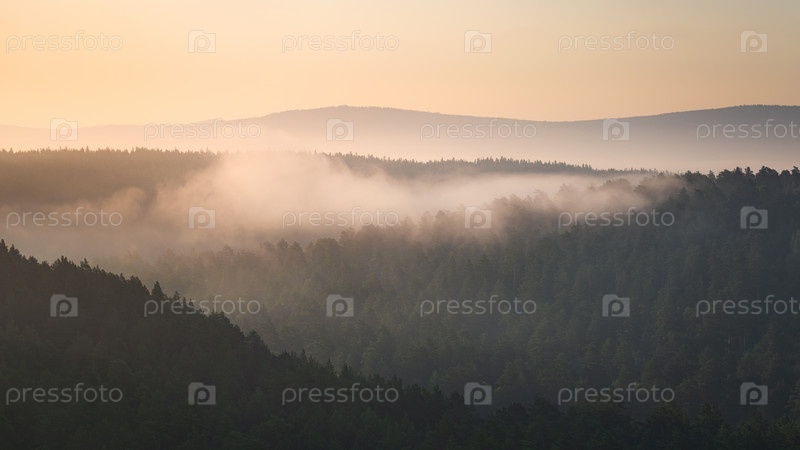 Туман стелется над слоями гор и лесом на рассвете