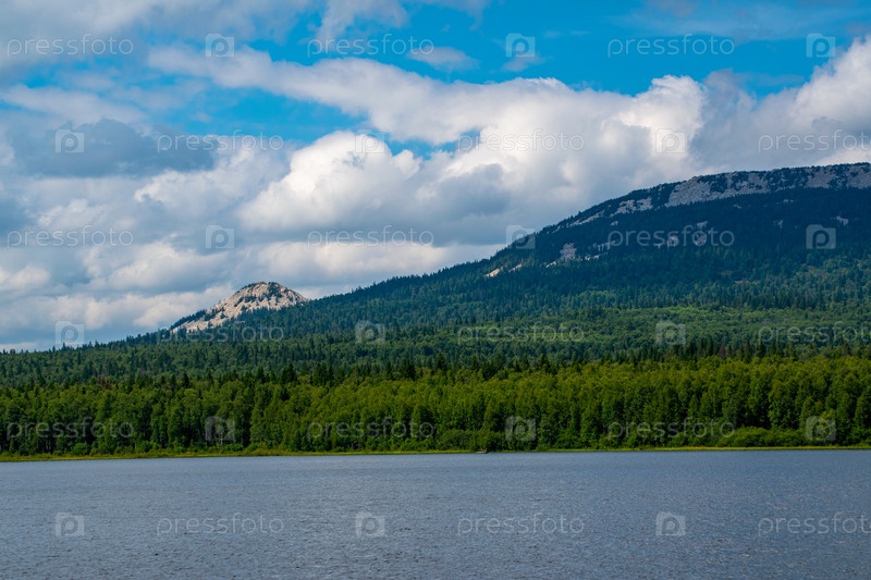 Облачное небо над горами и горным озером летним днем. Национальный Парк Зюраткуль
